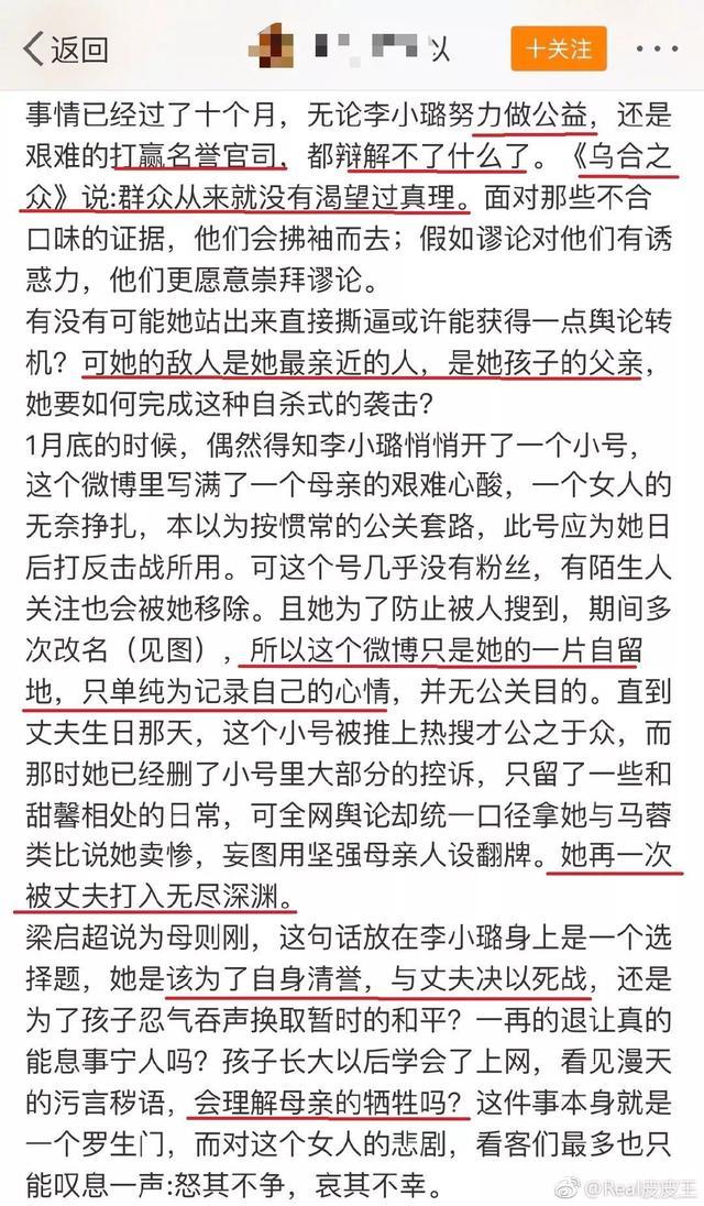 这篇文章的重点如下: 1、尽管李小璐做公益,打赢名誉官司,乌合之众们根本不care,还是只愿意相信李小璐的负面形象; 2、李小璐一直忍辱负重,为了孩子才不站出来和贾乃亮撕的; 3、李小璐的小号只是单纯记录心情,小号上了热搜她被骂卖惨,都是贾乃亮把她推入无尽深渊; 4、在pgone事件中,李小璐忍气吞声,牺牲了自己的清誉,只为保护孩子。