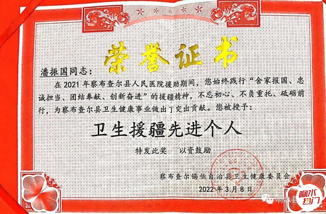 潘振国同志也因杰出的工作表现获得“第十批援疆工作优秀个人”、“伊犁州卫生优秀援疆专家”、“卫生援疆先进个人”、“优秀援疆医生”、“优秀援疆专家”等多项荣誉称号。