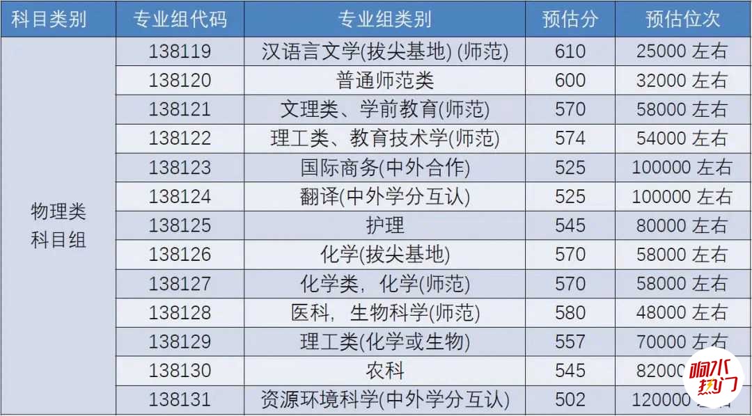 今年继续将地球科学与资源环境类、环境与健康实验班单独设置专业组,因此该10专业组和医学11专业组会较上面预估分低1分,也就是662分左右。