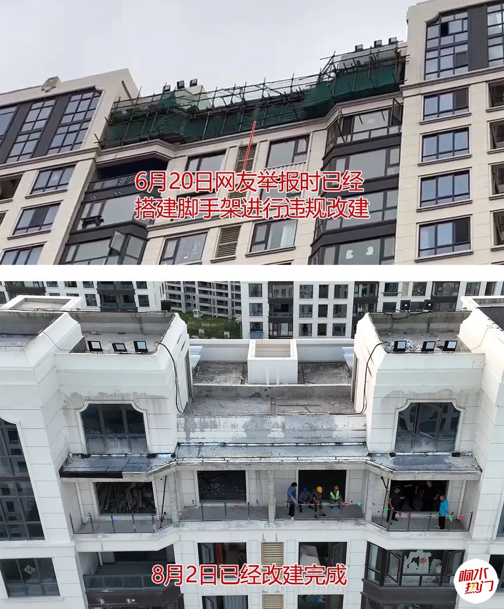 从下方的对比图可以看出,被举报多次的“破天荒”违建,竟然胆大到直接将复式楼层的外立面全部拆除,并在复式二楼加建了一整层贯穿式阳台。并在楼顶公共区域加了一道围墙,圈起了一块私人区域…… (改建前后格局对比)