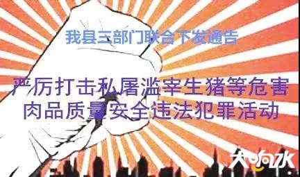 日前,县农业农村局、县公安局和县市场监督管理局联合下发《关于严厉打击私屠滥宰生猪等危害肉品质量安全违法犯罪活动的通告》。 1严格实行生猪定点屠宰、集中检疫制度。凡未在生猪定点屠宰厂(场)从事生猪屠宰活动的,依法予以取缔,没收生猪及其产品、屠宰工具和设备以及违法所得,并处货值金额3倍以上5倍以下的罚款;货值金额难以确定的,对单位并处10万元以上20万元以下的罚款,对个人并处5000元以上1万元以下的罚款,对没收的生猪及其产品按相关规定作无害化处理。构成犯罪的,依法追究刑事责任。 2生猪定点屠宰厂(场)、其他单位或者个人对生猪、生猪产品注水或者注入其他物质的,依法没收注水或者注入其他物质的生猪、生猪产品、工具和设备以及违法所得,并处货值金额3倍以上5倍以下的罚款,对生猪定点屠宰厂(场)或者其他单位的主要负责人处1万元以上2万元以下罚款;货值金额难以确定的,对生猪定点屠宰厂(场)或者其他单位并处5万元以上10万元以下的罚款,对个人并处1万元以上2万元以下的罚款。构成犯罪的,依法追究刑事责任。 3