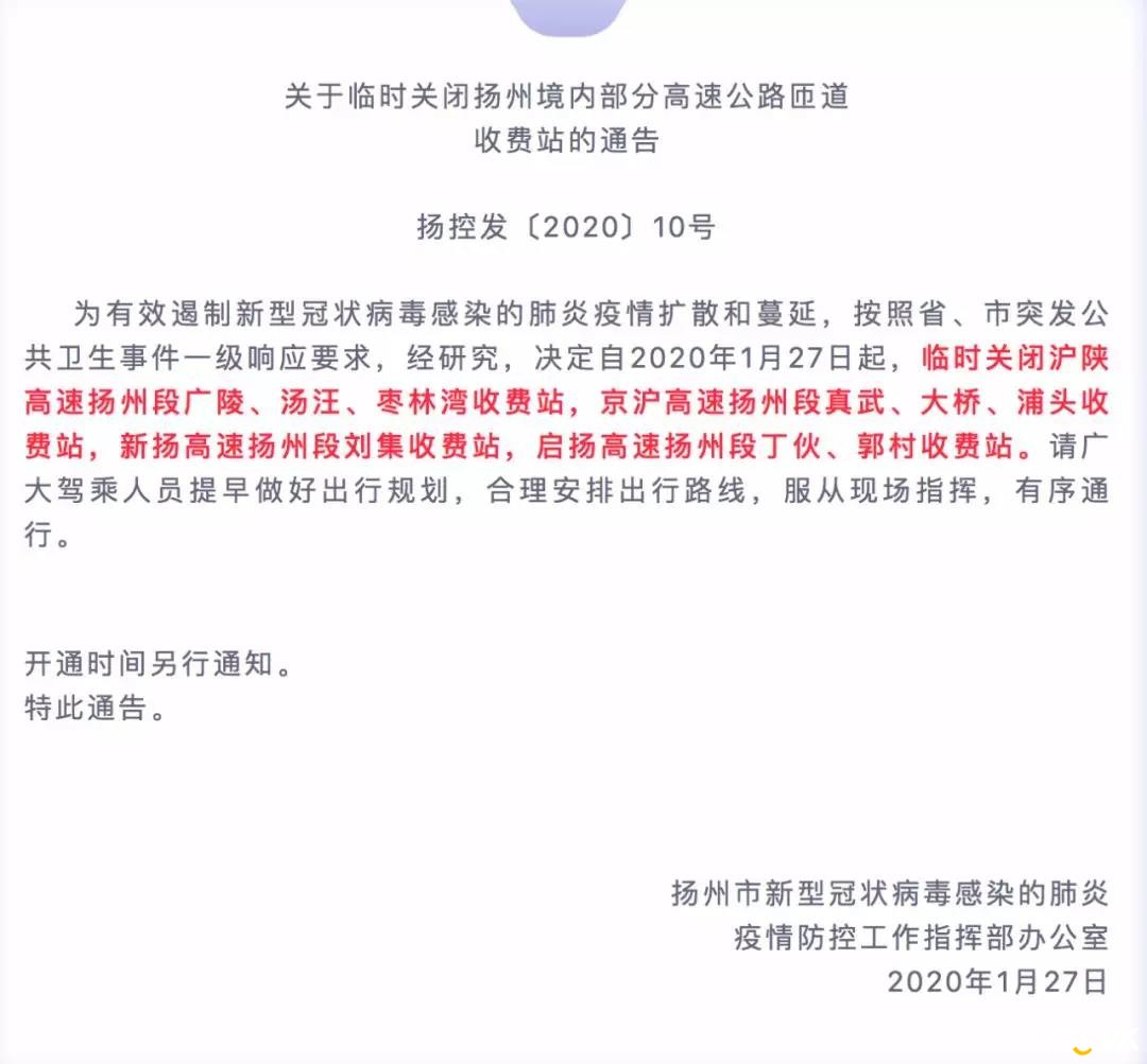 16:00最新:S80太仓港北疏港高速,关闭璜泾南双向出口;S82张家港疏港高速,关闭晨阳、张家港保税区双向出口;S83无锡支线,关闭望亭双向出口;S85溧阳支线关闭江苏中关村、上黄、长荡湖双向出、入口;S92金湖支线,关闭东阳双向入口;S69济徐高速丰县北收费站只有徐州牌照的车辆才可以下高速。同时,沛县收费站只有徐州牌照的车辆或持有徐州身份证的外地牌照车辆才可以下高速。G15沈海高速,往南通方向,在射阳至特庸枢纽附近,东台、刘桥至南通北附近,车辆排队较多,暂时关闭了射阳、兴桥双向入口;G2京沪高速,往上海方向,分别在扬州段的江都东附近、以及苏州段的花桥主线附近,车多缓行。G36宁洛高速,由安徽往二桥方向,在六合南枢纽附近缓行;G2513徐淮高速的徐州段,往淮安方向,在古黄河服务区附近车辆较多。G50沪渝高速,往上海方向,苏沪站附近,车辆较多;S49新扬高速宿迁段,往扬州方向,在泗洪、双沟路段车辆较多。为了缓行通行压力,关闭泗洪和泗洪南双向入口。请有需要的车友注意提前绕行。苏通大桥段,由南通往苏州方向,在北主线至小海附近,车辆排队较多。 根据《常州市人民政府关于实施新型冠状病毒感染的肺炎疫情一级响应措施的通告》要求,为有效切断病毒传播途径,现就临时关闭高速公路部分入常道口通告如下:一、沪蓉高速公路(G42):临时关闭常州、罗墅湾入常道口,薛家、青龙、横山桥道口正常开放。二、沪武高速公路(G4211):临时关闭戚墅堰、滆湖、金坛东、茅山入常道口,常州南、嘉泽、金坛道口正常开放。三、扬溧高速公路(G4011): 临时关闭金坛西、后周入常道口。四、长深高速公路(G25): 临时关闭溧阳西、溧阳东、曹山入常道口,上兴、溧阳南道口正常开放。五、江宜高速公路(S39): 临时关闭武进南、龙城大道、春江入常道口,邹区、孟河互通道口正常开放。六、常溧高速公路(S85): 临时关闭长荡湖、上黄、中关村互通入常道口,儒林、溧阳北道口正常开放。本通告自发布之日起施行,终止日期另行通告。常州市新型冠状病毒感染的肺炎疫情防控应急指挥部 2020年1月27日 综合:江苏省交通运输厅 官方微博 |