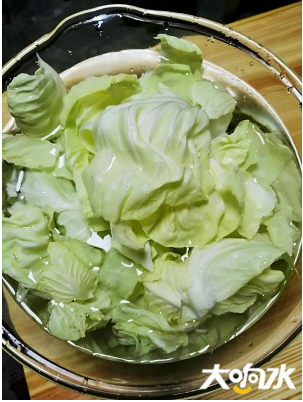 包菜用手撕成大块 一片叶子一分为二最佳 放入水中待用 要用的时候再沥干水分