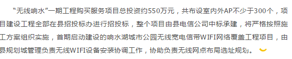 也就是说算下来大概50W的费用,响水投资了550W,还只是光打造无线响水湖的费用。那么剩下的500W用在了哪里,希望有人可以来为楼主解答一下,有关部门也行啊。
