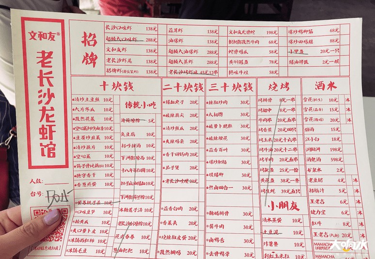 菜单也很复古,除了招牌的龙虾这些,下面分成了十块钱、二十块钱、三十块钱等几个区块,很多被铅笔划掉的代表卖完了或者中午不供应。