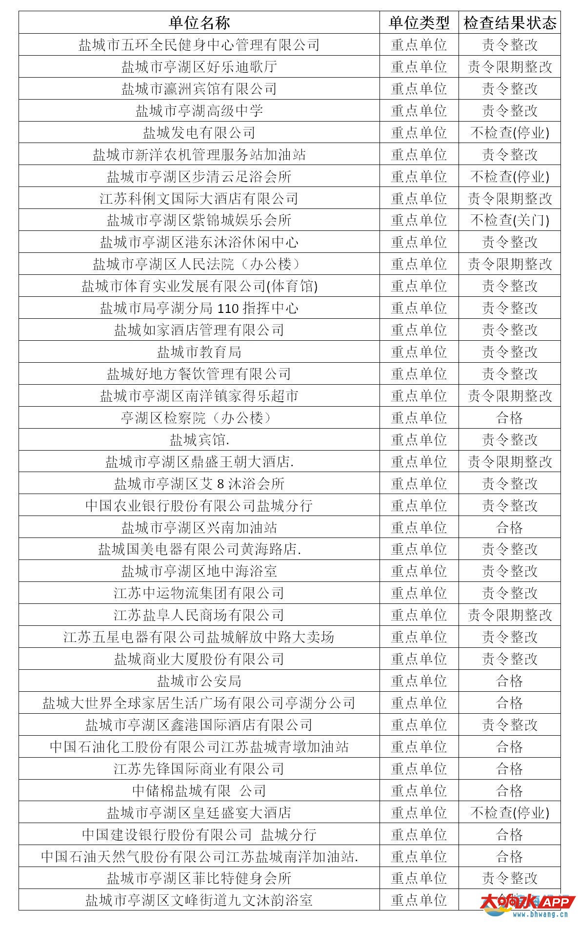 公 告 根据《中华人民共和国消防法》和应急管理部消防救援局《关于全面推行“双随机、一公开”消防监管工作的通知》,盐城市消防支队已于2019年10月1日起实行“双随机、一公开”消防监管抽查,现向社会公开2020年10月份单位的抽查结果及11月份全市随机抽查事项清单和抽查计划,请相关单位认真遵守消防法律法规,落实消防安全主体责任。