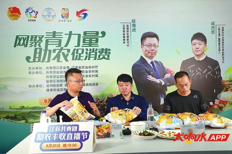 盐都团区委副书记经海虎(左一)走进直播间推介产品。