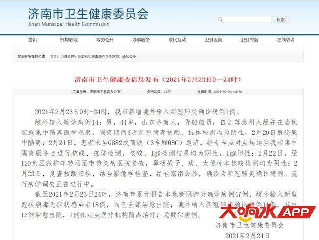 2月24日,据山东省济南市卫健委消息,2月23日,济南新增境外输入新冠肺炎确诊病例1例。
